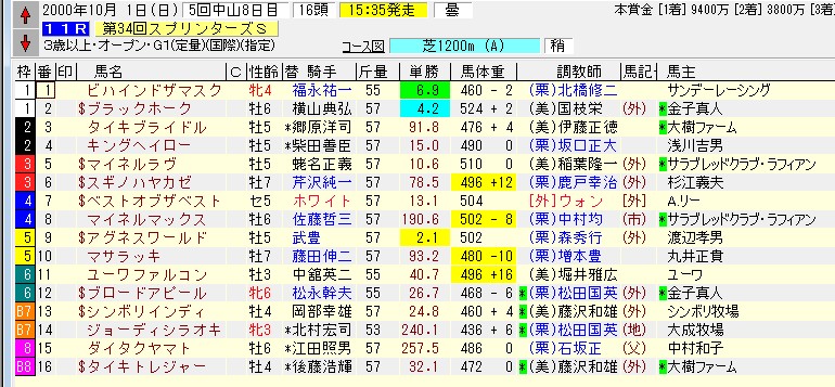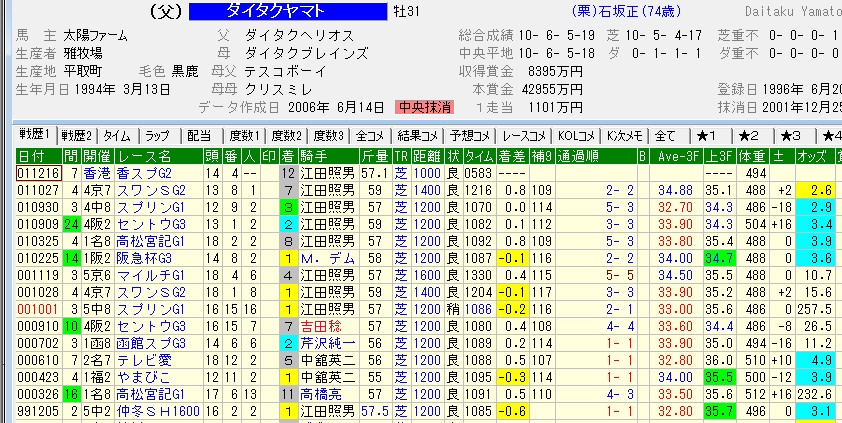 海外G1を勝って挑んで来たアグネスワールド断然という雰囲気だったのがこの年、私の本命は覚えてませんが、ダイタクヤマトでない事は確か(笑)いや、ダイタクヤマトはチェック馬にはしてたのです、少し前にトロットスター相手に完勝してましたし、確か、2走前の函館SPでは本命打ってたはずです、ただ、次のセントウルステークスが全然駄目だったので、さすがにG1のスプリンターズステークスで本命までは・・・しかも、前に行く馬にアグネスワールドが君臨してる、当時良く使ってた表現で「アグネスワールドが前を掃除したら手も足も出ない」と。
